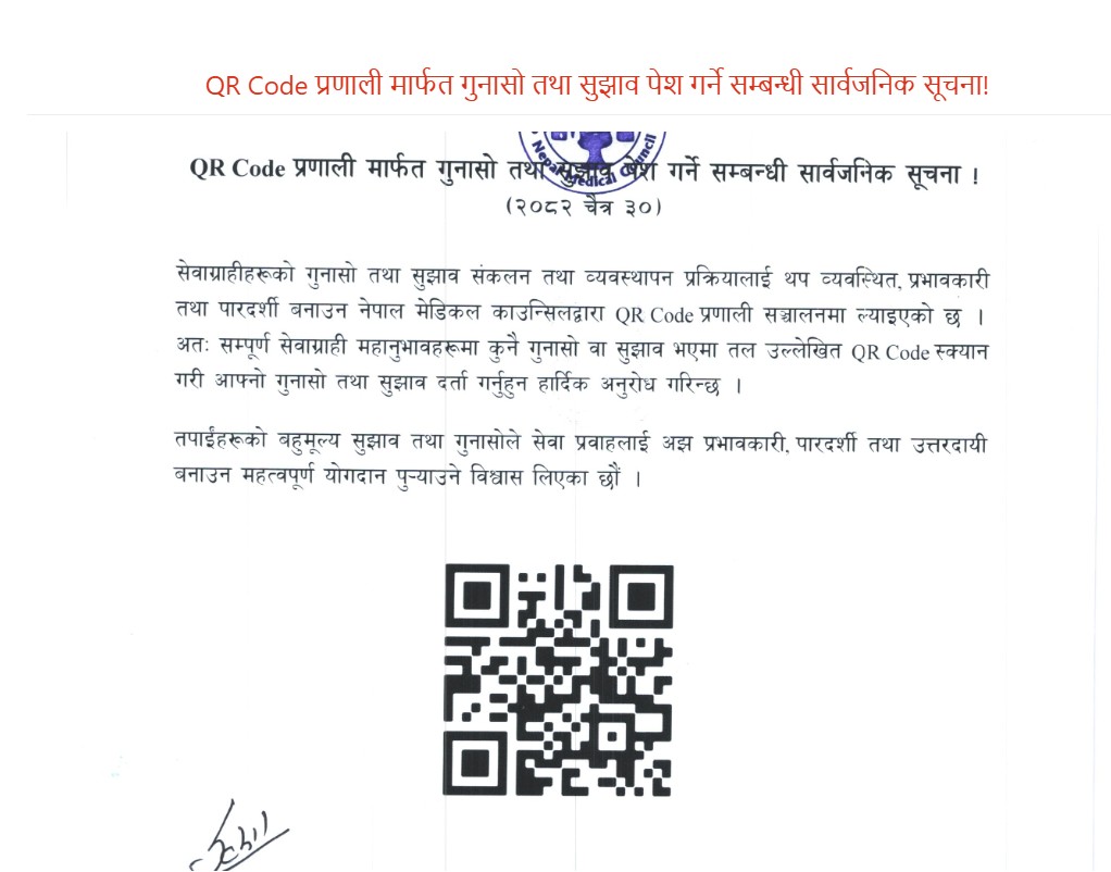 काठमाडौँ । नेपाल मेडिकल काउन्सिलले आफ्नो सेवालाई थप व्यवस्थित, प्रभावकारी र पारदर्शी बनाउन नयाँ प्रविधि अपनाएको छ । काउन्सिलले सेवाग्राहीका गुनासो तथा सुझावहरू संकलन र व्यवस्थापन गर्न क्यूआर कोड प्रणाली सञ्चालनमा ल्याएको हो ।