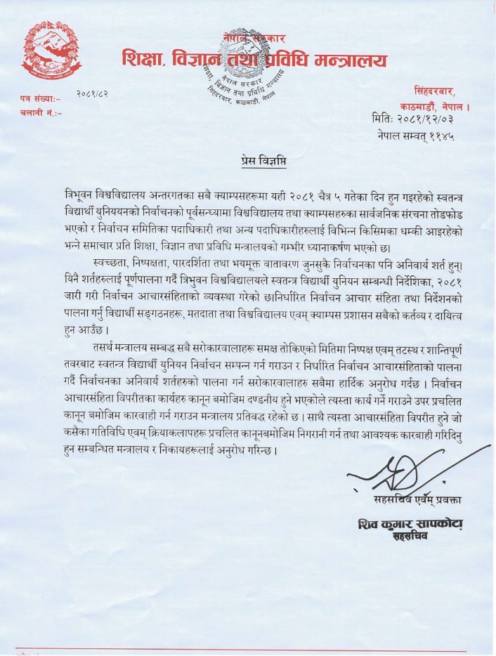 चैत ५ गते हुन लागेको स्ववीयू निर्वाचनलाई विथोल्न खोज्ने र आचारसंहिता विपरीत कार्य गर्नेलाई कारबाहि गर्न शिक्षा मन्त्रालयले सम्वद्ध निकायलाई अनुरोध गरेको हो ।