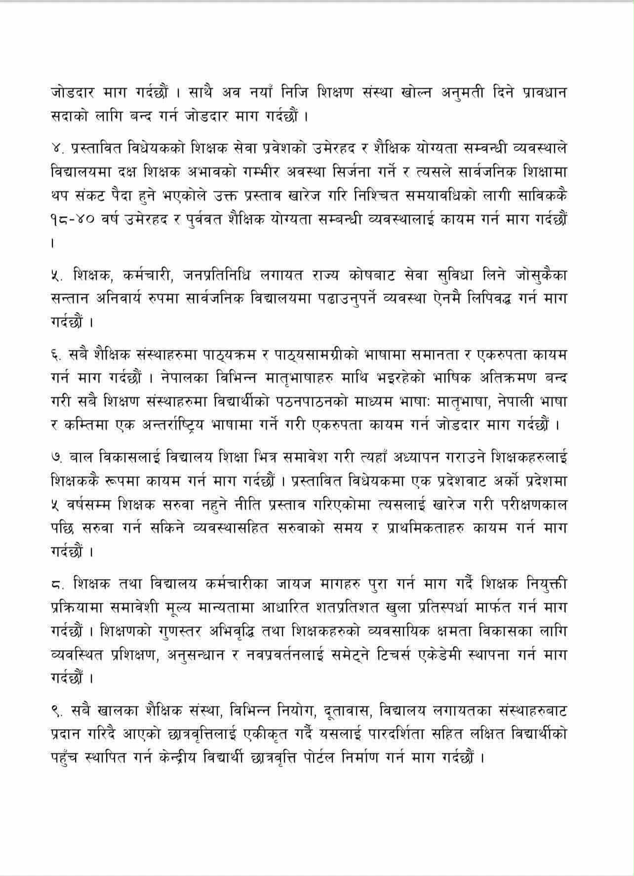 ज्ञापनपत्रमा भनिएको छ, “प्रस्तावित विधेयकको शिक्षक सेवा प्रवेशको उमेरहद र शैक्षिक योग्यता सम्वन्धी व्यवस्थाले विद्यालयमा दक्ष शिक्षक अभावको गम्भीर अवस्था सिर्जना गर्ने र त्यसले सार्वजनिक शिक्षामा थप संकट पैदा हुने भएकोले उक्त प्रस्ताव खारेज गरि निश्चित समयावधिको लागी साविककै १८–४० वर्ष उमेरहद र पुर्ववत शैक्षिक योग्यता सम्बन्धी व्यवस्थालाई कायम गर्न माग गरेको छ । ”