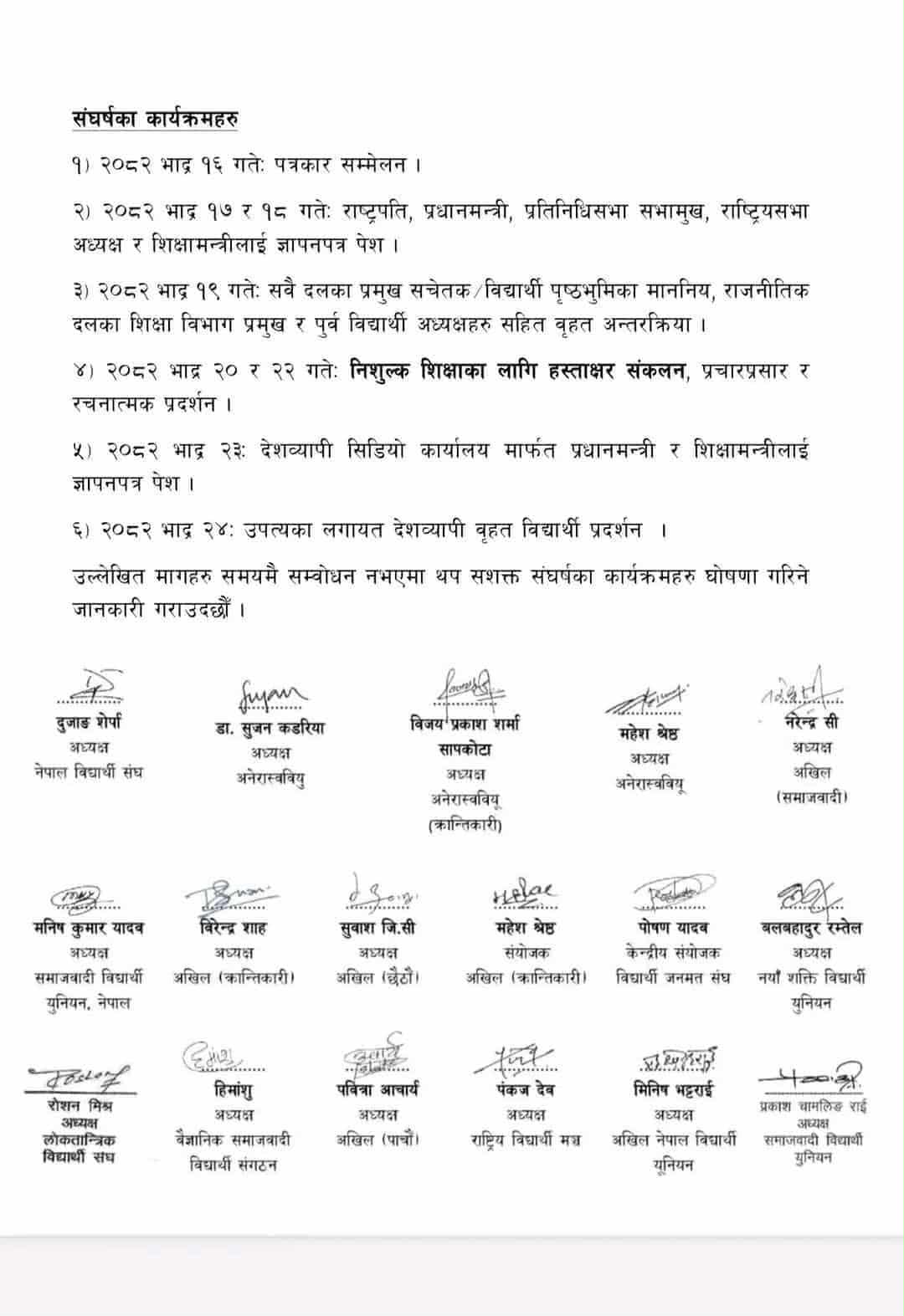 नेपाली कांग्रेस, नेकपा (एमाले), नेकपा (माओवादी केन्द्र), मोहन बैद्य नेतृत्वको अखिल क्रान्तिकारी सहित विभिन्न दलका निकट विद्यार्थी संगठनहरूले यसअघि नै शिक्षामा निजीकरण र व्यापारिकरणको विरोध गर्दै सोमबार संयुक्त आन्दोलनको घोषणा गरेका थिए । सोही अभियानअन्तर्गत उनीहरूले कार्यवाहक प्रधानमन्त्रीसहित विभिन्न दलका नेताहरूसमक्ष माग प्रस्तुत गरेका हुन् ।