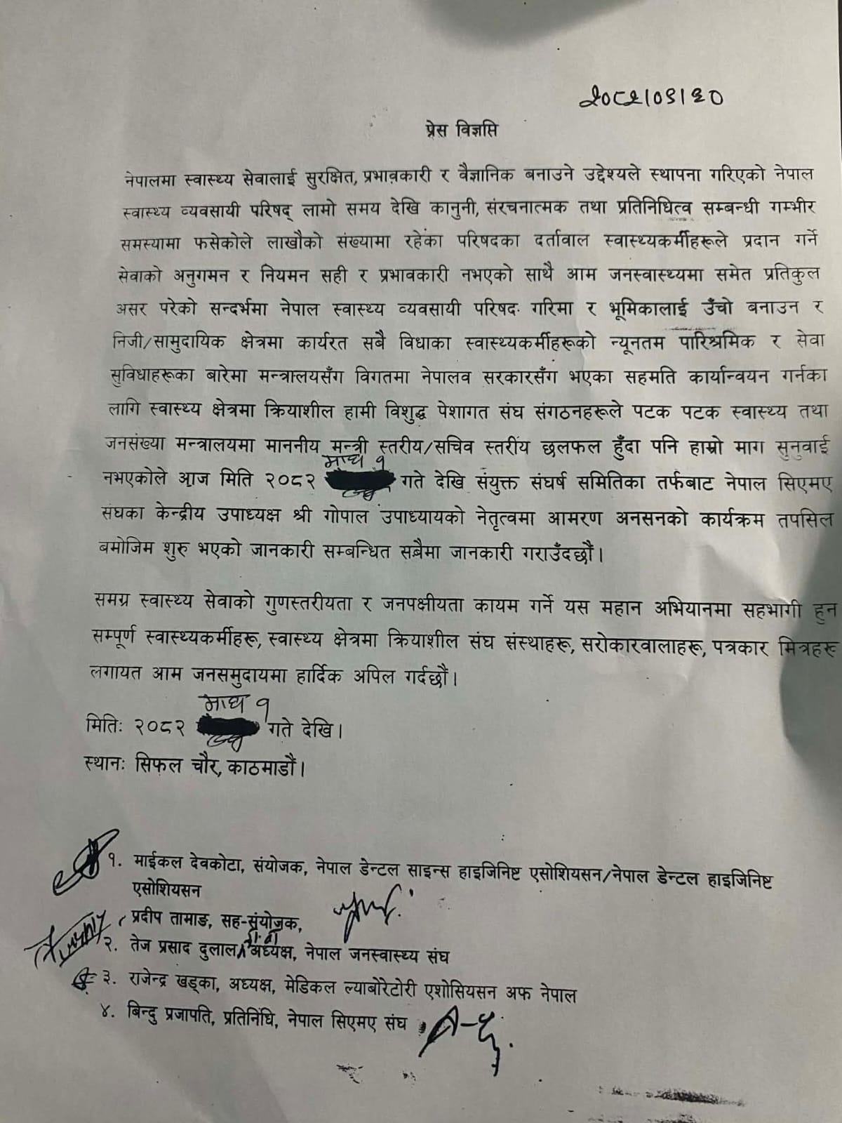 काठमाडौं । नेपाल स्वास्थ्य व्यवसायी परिषद् लामो समयदेखि कानुनी, संरचनात्मक तथा प्रतिनिधित्वसम्बन्धी गम्भीर समस्यामा फसेको भन्दै स्वास्थ्य क्षेत्रका विभिन्न पेशागत संघसंस्थाहरूले भोलि विहिबारदेखि काठमाडौंको सिफल चौरमा आमरण अनशन सुरु गर्ने भएका छन् ।