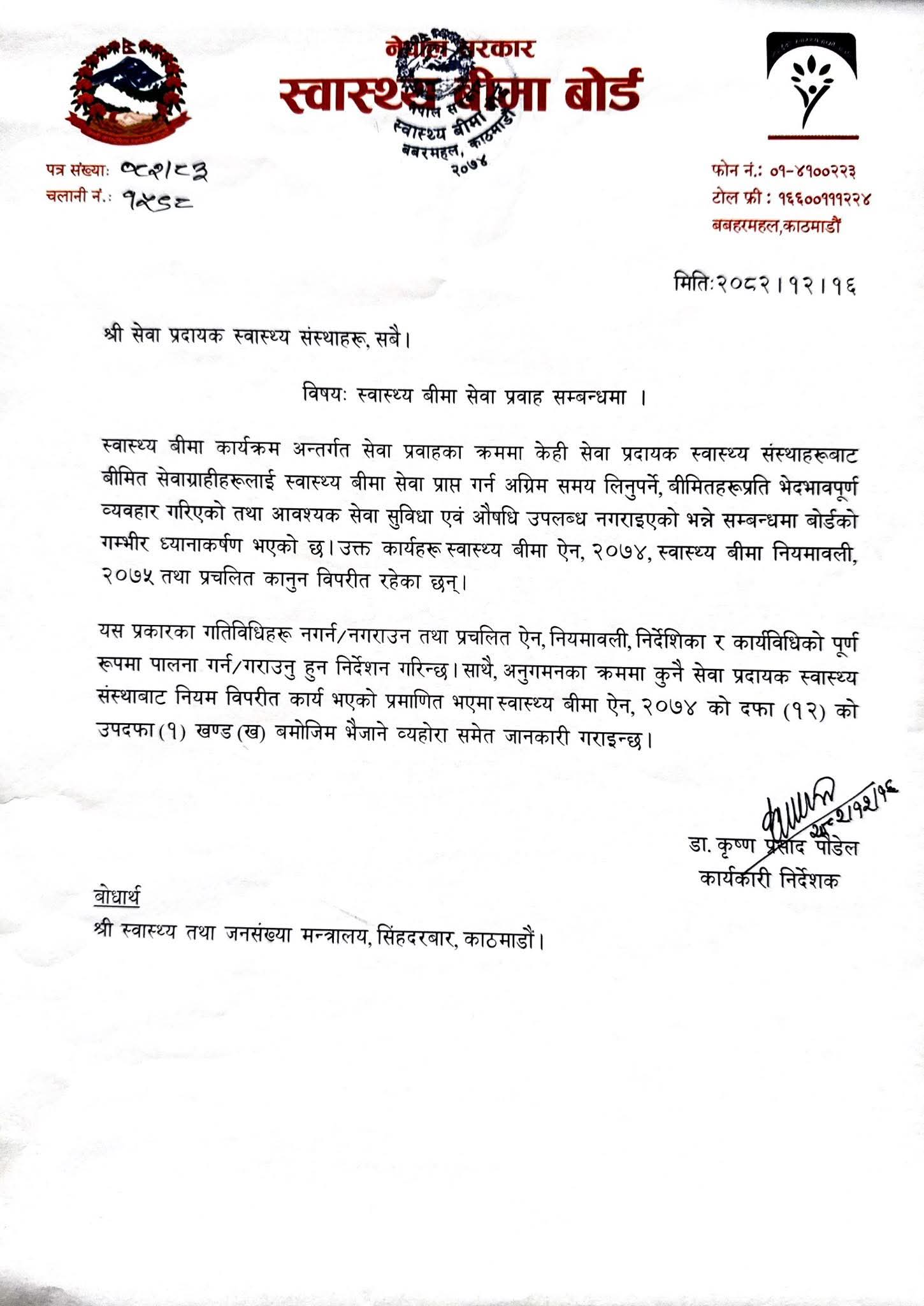 यो निर्देशनको बोधार्थ स्वास्थ्य तथा जनसंख्या मन्त्रालयलाई समेत दिइएको छ। पछिल्लो समय सरकारी र निजी दुवै क्षेत्रका केही अस्पतालहरूले बीमा सुविधा लिने बिरामीलाई उपेक्षा गर्ने गरेको व्यापक जनगुनासो आउने गरेको थियो। बोर्डको यो पछिल्लो सक्रियताले बिमितहरूले झन्झटरहित ढंगले स्वास्थ्य सेवा र औषधि प्राप्त गर्ने र बीमा कार्यक्रमको प्रभावकारिता बढ्ने अपेक्षा गरिएको छ।